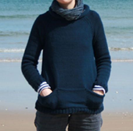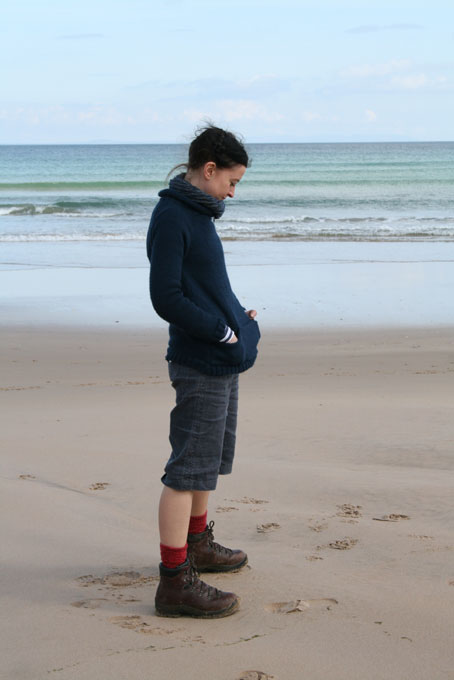 Anyway, as I began by saying: I have knitted myself an outdoor sweater. In my stash I had several balls of navy cashmerino aran that I bought back in 2005. At 33% microfibre, this stuff is almost a fleece already and eminently suitable for a light and warm outdoor sweater. I liked the matelot-like feel, the shape of the neck, and the workman’s pockets on kaari, a Norah Gaughan sweater from her first Berocco book. The versions I saw on ravelry were lovely, but the fit seemed quite big, so I knit the cashmerino on 4 and 4.5mm needles, also attempting to reduce the pilling associated with this yarn. Its a satisfying, simple pattern and knit up very quickly. I finished seaming it last week, and over the bank holiday, wore it walking in North Antrim.
