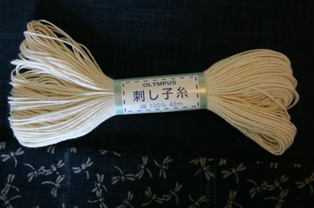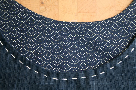 I then made some running stitches around the neck and along the pocket (to separate off three different sections) with sashiko thread: