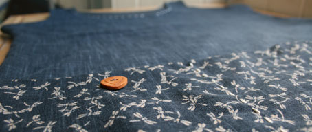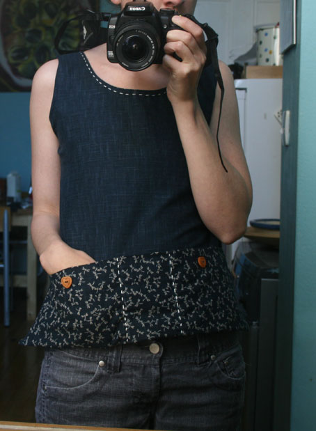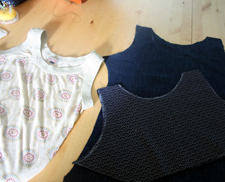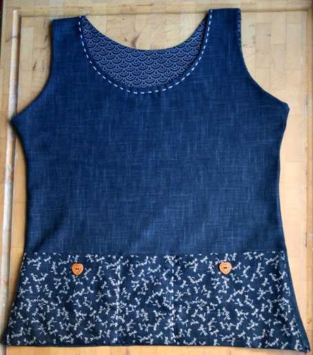 Nice and simple. This was made from the remaining piece of dark indigo-dyed cotton I used for the top in the previous post, and two fat quarters (one with a wave, and one with a crane-fly print). Again, it’s a Japanese dobby-weave fabric. It has a linen-like hand and hang, both of which I really like. I only have a few more fat quarters of this lovely stuff left and am tempted to combine the whole shebang into some joyous all-over garment of Japanese dobby. I may look odd, but who cares? I really enjoyed Felix’s recent post, in which she talks about her forthcoming patchwork skirt as a ‘portable case of ideas.’ Brilliant!