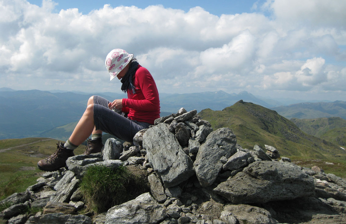 Did I mention the weather is superb in Scotland at the moment? We took advantage of it yesterday, climbing Meall nan Tarmachan, and the four tops that make up the Ptarmigan ridge. I remembered my knitting this time. Here I am working on a sock at 3422 feet.