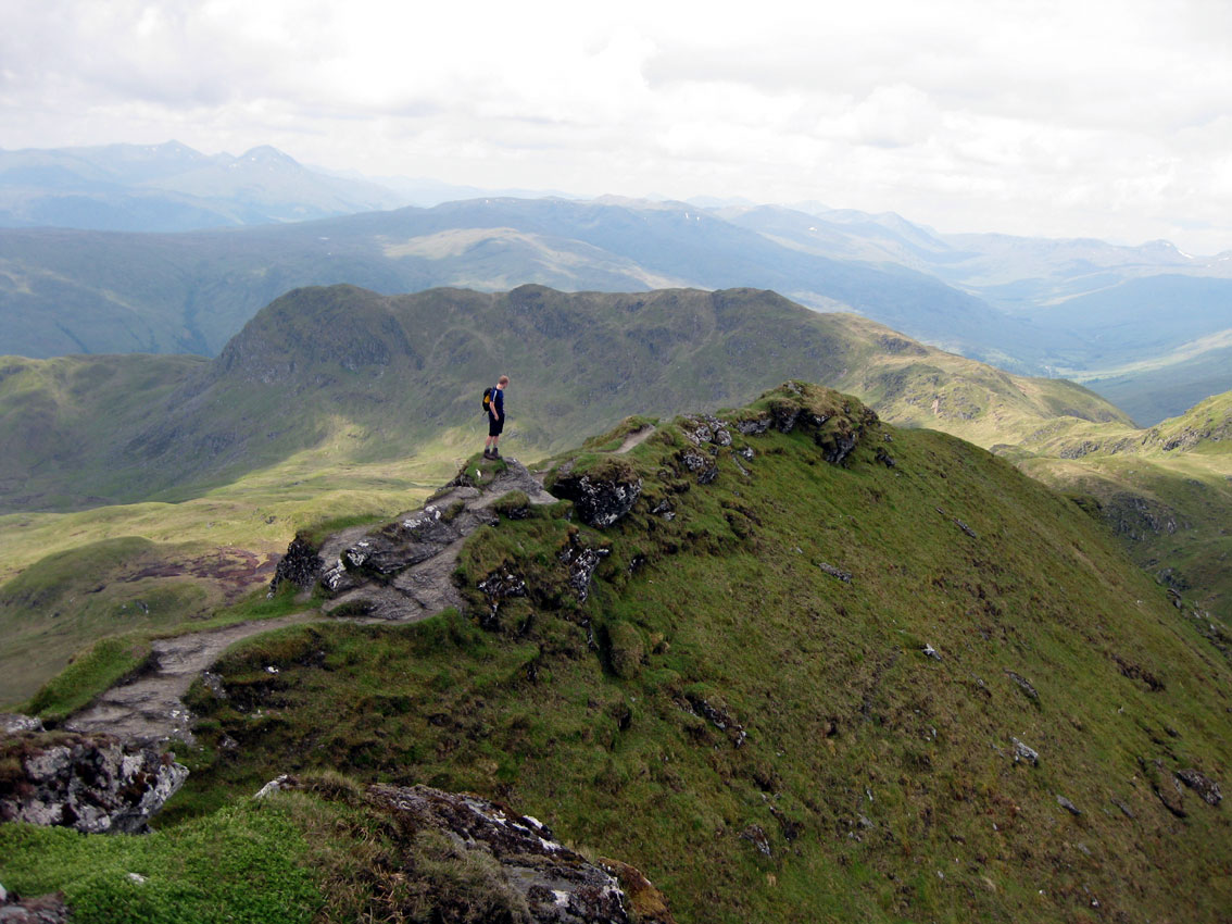 It was a very clear day and the views were absolutely wonderful. We could see Ben Lui (which we climbed a couple of weeks ago), the whole of the highlands north to the Mamores, and the great snowy hulk of Ben Nevis below the clouds in the distance. I do like to stand on a mountain, looking at all the other mountains I have climbed at other times. I think of my earlier selves climbing those hills, negotiating corries, colls and ridges. I think of other days and other walks, and the peaks look back at me like old friends.