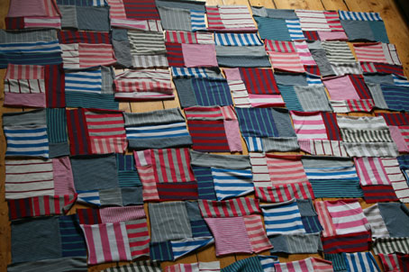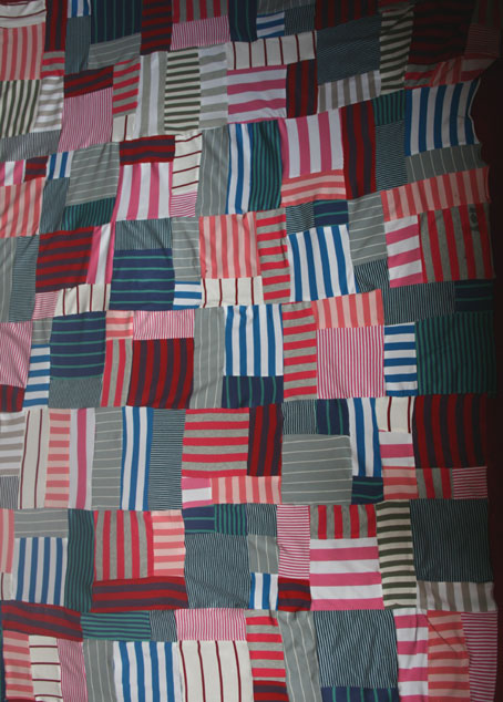 For the first quilt I chose twelve of Belle’s many stripey t-shirts. I cut them up and pieced them. The cutting was emotionally rather difficult. Once I had the pieces, though, the process became more abstracted and easier to do. I was making something, not cutting up her clothes, and the t-shirts were becoming another thing.