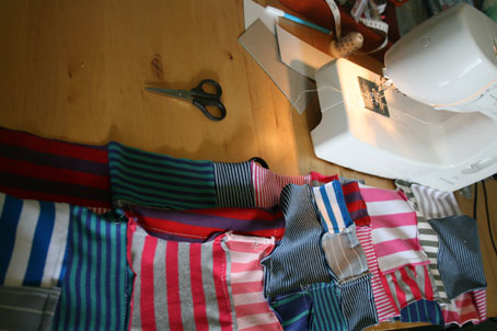 Piecing the T-shirts was quite tricky at times, because of the different mix of fabrics. Some are made of pure, and rather heavy cotton jersey, others are lighter, and contain different percentages of viscose, lycra, and elastene. Not only did the pieces (being made of essentially of knit stockinette) want to curl up, each separate piece behaved differently under the sewing machine because they were made of different fibres. And the fact that I wanted my stripes to go in different directions — often against the grain of the fabric — complicated matters even further. Aigh!