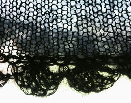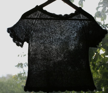 Now, a word about knitting black kidsilk haze: DON’T!. It was like dealing with a fractious, elusive, woolly creature. I couldn’t see my stitches. I couldn’t tell the right from wrong side. I couldn’t see a berloody thing. And that’s to say nothing about the prospect of pulling back stitches or frogging the stuff. The yarn is pure evil! At least the body and sleeves were mindless tubes of stockinette — I just went round and round — but imagine the horror of the crochet. Sheesh. Never again.