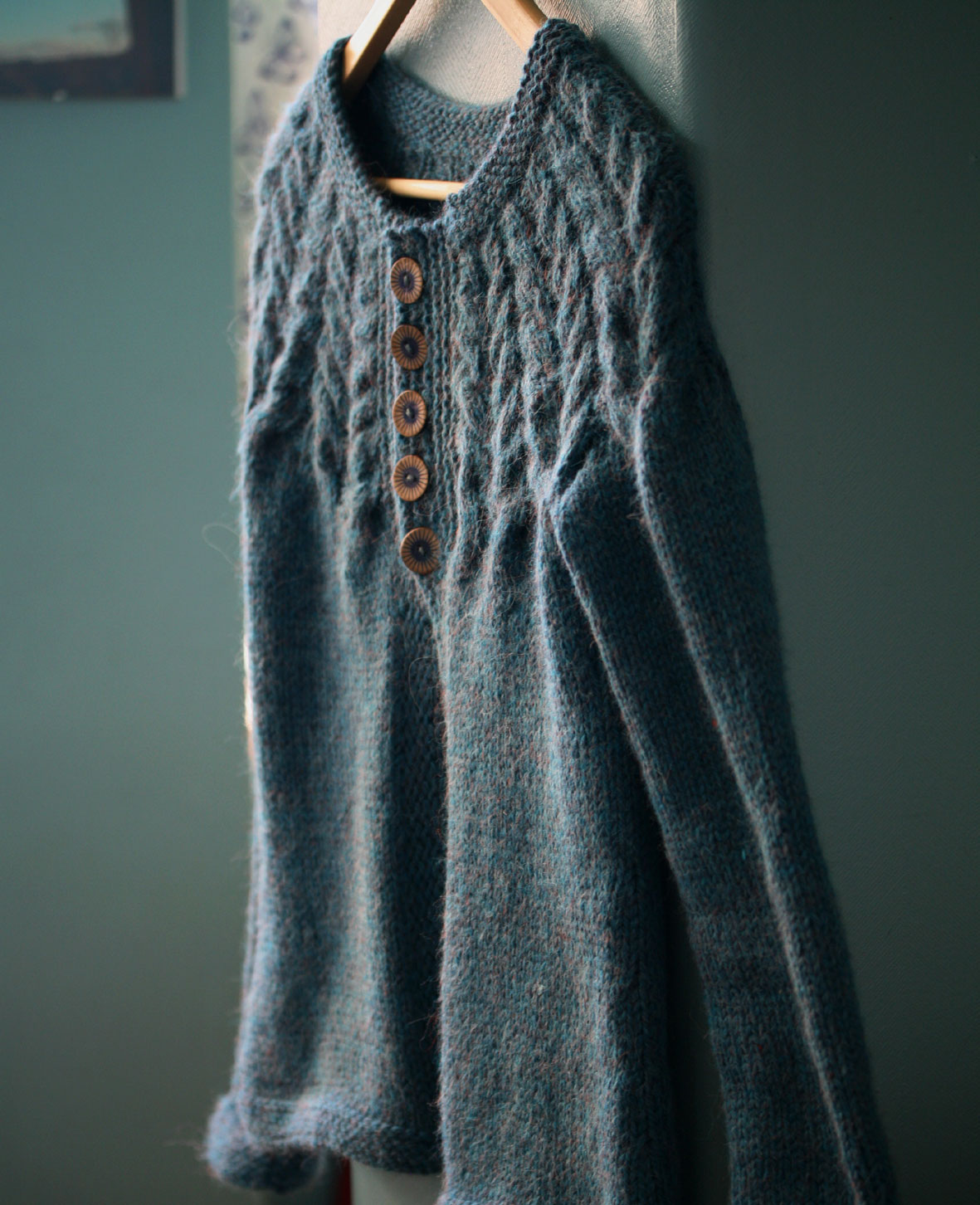 . . . the buttons looked fab. I sewed in the ends and tried on the cardigan. It was a great fit. The neckline dipped, the fronts hung well, the cables stood out, and there wasn’t a decrease or a sign of a short-row to be seen. “That looks really good,” said Tom. This was an excellent cardigan, a superlative cardigan, a cardigan with which there was no problem at all — except that I hated it!