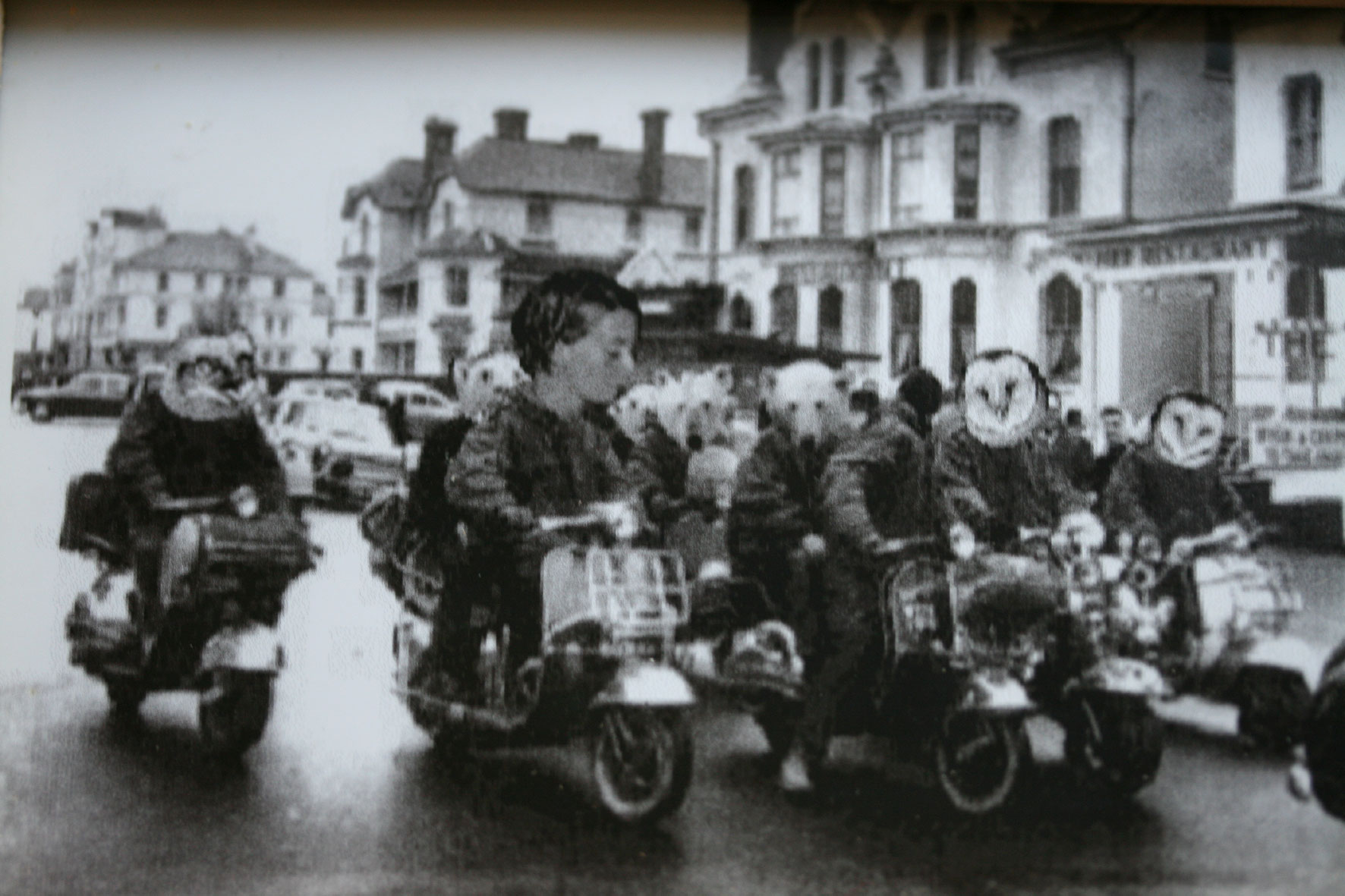 Clearly there are many of you who like owls just as much as I do! Owl tattoo, Kirsty? Cor! As a brief glimpse into the murky depths of my long-standing owl obsession, I thought I’d show you a birthday card Tom made for me eight years ago. At this time, we were in our mod phase, and rode around Sheffield on 1960s Lambrettas we had acquired from the legendary Armando. The title of Tom’s genius artwork is “Wazz Rides with Owls and Bears”. It shows a heavily photoshopped still from the film Quadrophenia, with my head (note short haircut and youthful demeanour), and the heads of several owls and bears, superimposed over those of Phil Daniels and the other riders. Riding with owls. What could be better?