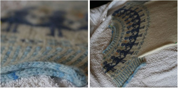 The sweater is blocking now, but I couldn’t resist showing you a quick peek before I put it on and (no doubt) run about in it, throwing some foolish shapes: