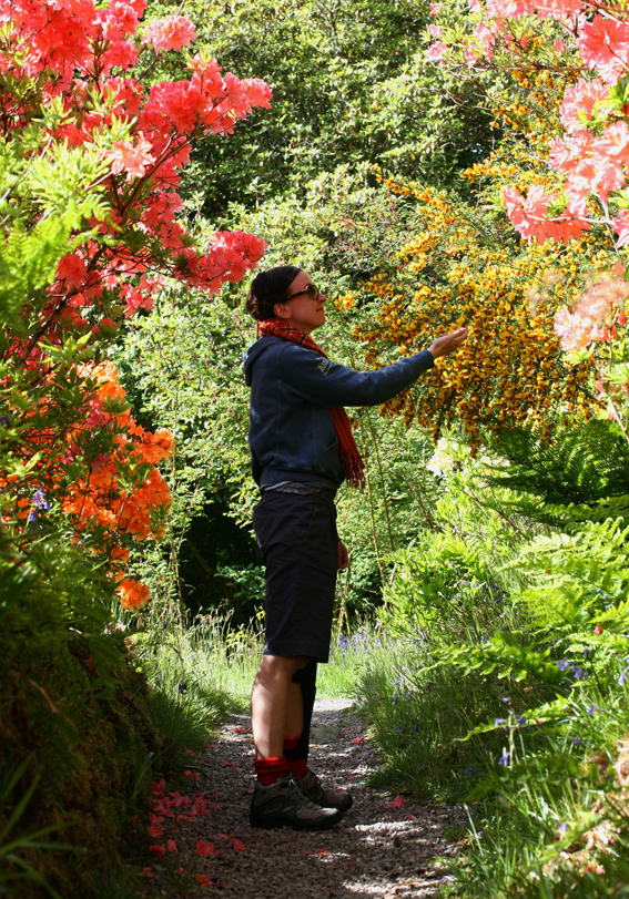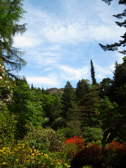 The Crarae burn tumbles down the hillside to Loch Fyne, and the garden is built around the water and its gorge. Petal-strewn paths and bridges criss-cross the burn through colourful, gloriously scented woods, while the presence of larches, firs, and and tantalising glimpses of the surrounding lochs and mountains remind you that you are in Scotland, not the Himalayas.