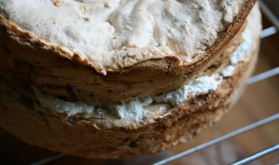 While I was in hospital, Tom did not bake much, and consequently found himself buying a fair few cakes. He developed a fondness for a particular dessert made by Maison Blanc for Waitrose – a sort of chewy, nutty meringue, sandwiched together with mascarpone. He has been wanting to make this since he first tried it, but the cake was bewilderingly unnamed on the Maison Blanc box, and his search for a recipe was initially hampered by the fact that neither of us really knew what to call it. When I was a kid, Smiths, our local bakers sold something similar, (albeit less deluxe) which we referred to as a japonais, but a search for this did not turn up a recipe.