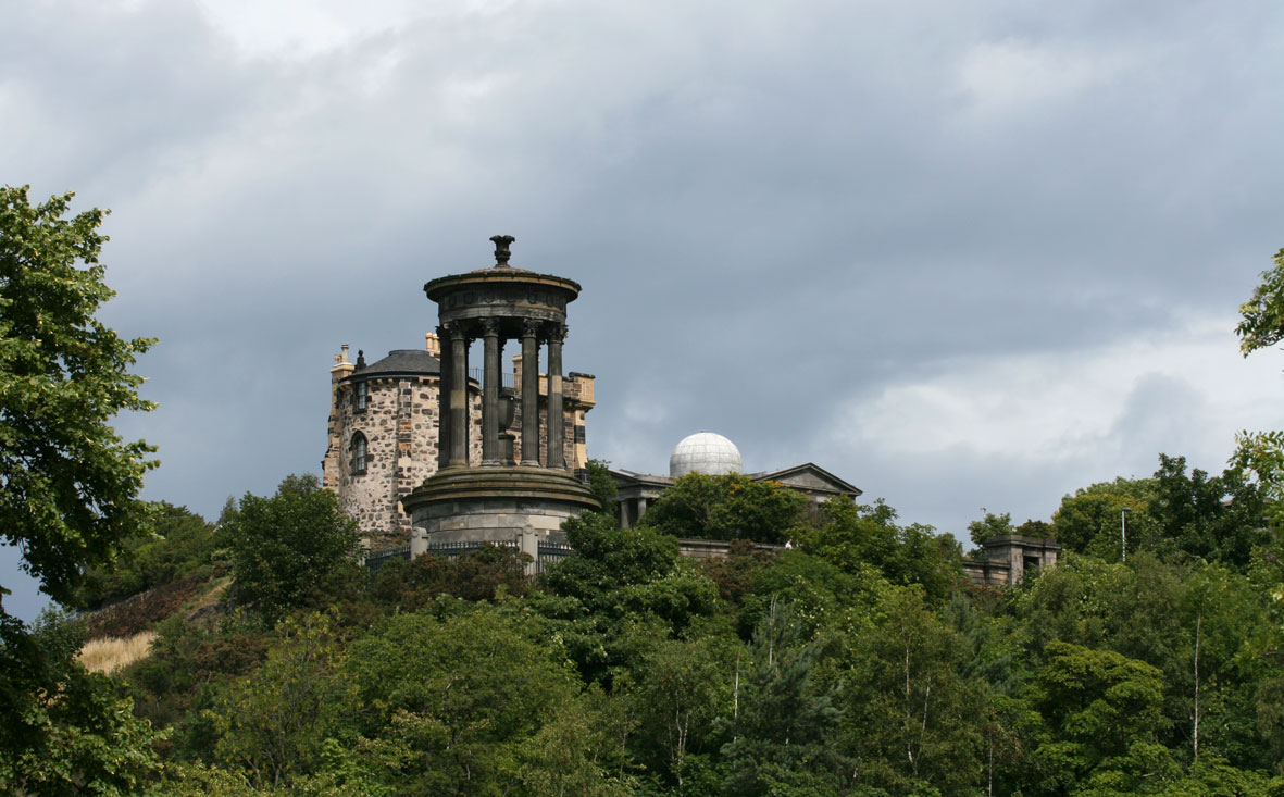 Calton Hill is not high, but because of its position in the city it has a distinctive sort of prominence. Once the site of a gibbet and a jail, over the course of the Nineteenth Century, the hilltop became home to a crazy jumble of unrelated structures, the most notorious of which is the unfinished national monument (seen above), which was originally meant to commemorate Scotland’s dead in the Napoleonic Wars. Other men have other monuments here too, including Nelson, whose memorial was apparently designed to resemble the admiral’s telescope. This architectural conceit, according to Robert Louis Stevenson, makes the Nelson monument “rank among the vilest of men’s handiworks.”* You can make up your own mind.