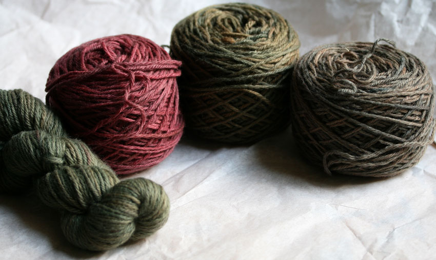 Close up, you can see that second-from-right is more greyish, with lots of brown and yellow tones, while far-left is much more determinedly green, with pinkish-purplish hints running through it. I suppose it is the use of the same natural dyes in different combinations, as much as the variegations from the dyeing method, that make these skeins so complex . . . and this stuff must be what dyers think about all the time. . . anyway, I loved both the proximity and the distance of the colours in these skeins, and wanted to knit something to show them off. So I worked a few swatches, developed a shaded-stripe sequence from my four colours, and then knit a tank following Wendy Bernard’s great top-down instructions in Custom Knits. This is an interesting method: you begin provisionally; start knitting flat at the back underarms; work up and over the shoulders, then down the front, before joining back to front at the underarms, and working down to the bottom edging. This was the first time I’d tried this construction, and I rather liked it. But I am such a sucker for the speed and rhythm of stockinette in the round that I would be tempted to work bottom-up and steek the armholes, simply to avoid the purls . . . (I seem to be in a strange phase in which I only want to knit tubes of varying dimensions).