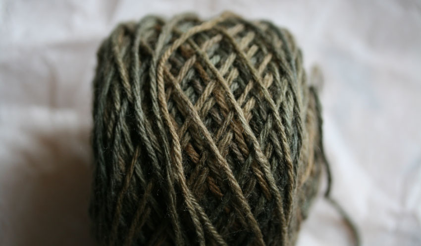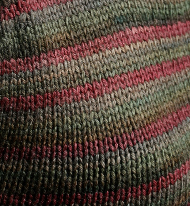I find BFL a very curious fibre: it is obviously woolly, but it is so smooth, that when working with it it, one sometimes feels like one is knitting with cotton. The fabric it has produced here is so flat and matt and neat that it almost looks machine knit (in comparison to my usual hand-knitted surfaces, anyway). I love the depth of colour in the muted stripes I ended up with: