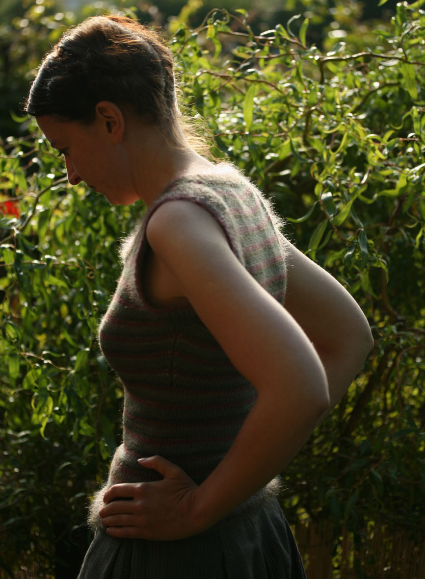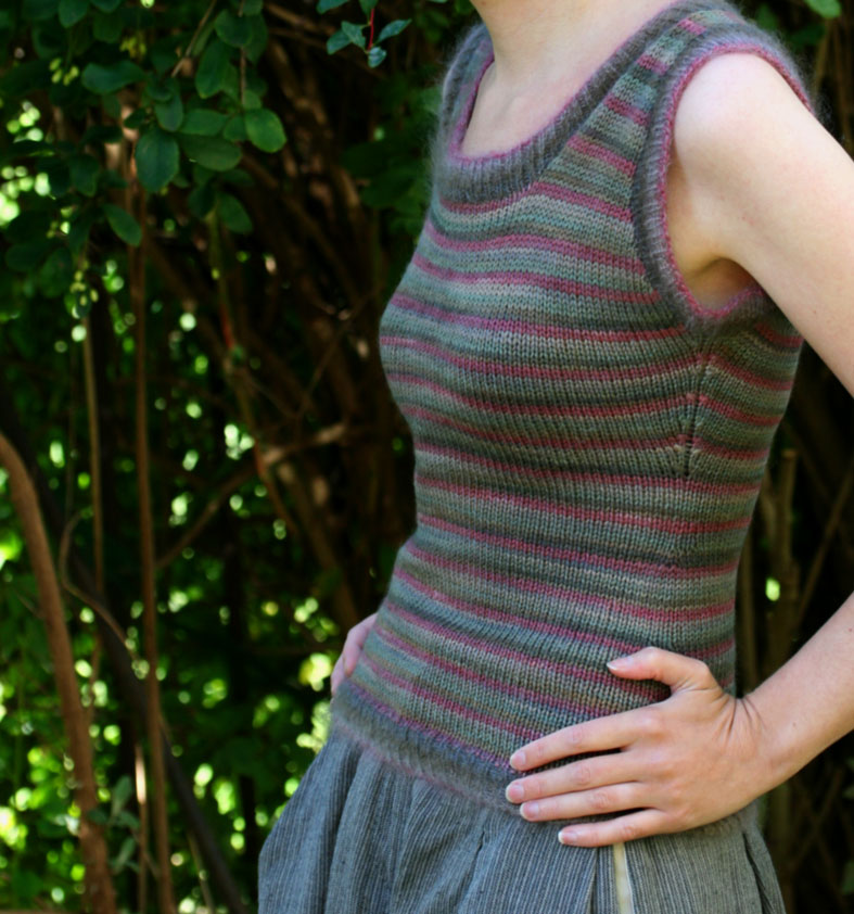 Anyway, the end result was a simple, close-fitting tank which shaded the colours quite nicely, and which was softened around the edges with a fuzzy mohair halo. It could be the stripes, the colours, or just the basic nature of the garment, but I think that the tank has a worn, old-Boden feel to it, if you know what I mean.