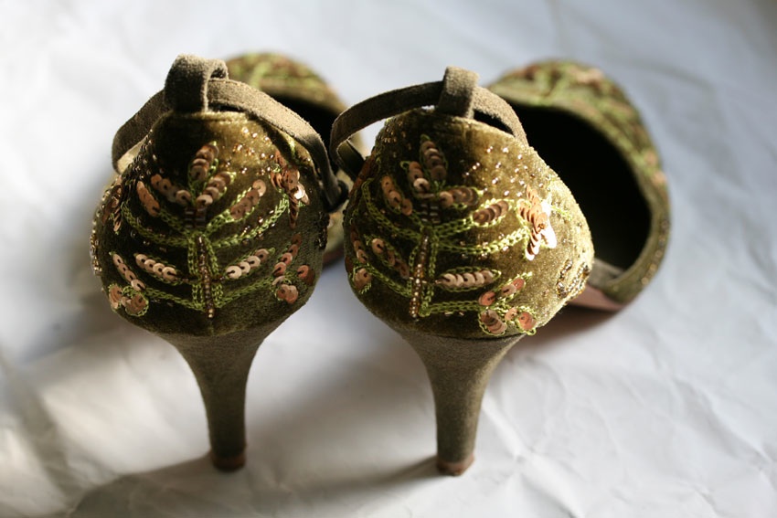 This blog has also kept a record of my shoes, and different pairs have accompanied many different hand-made garments and occasions over the past few years. There are blue shoes in this post; the fun red pair that I am wearing on my birthday here; the suede stilettos I wore when modelling Manu, and another green pair of which I was particularly fond.