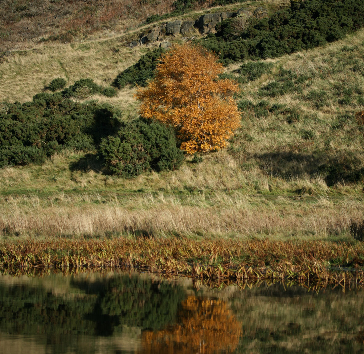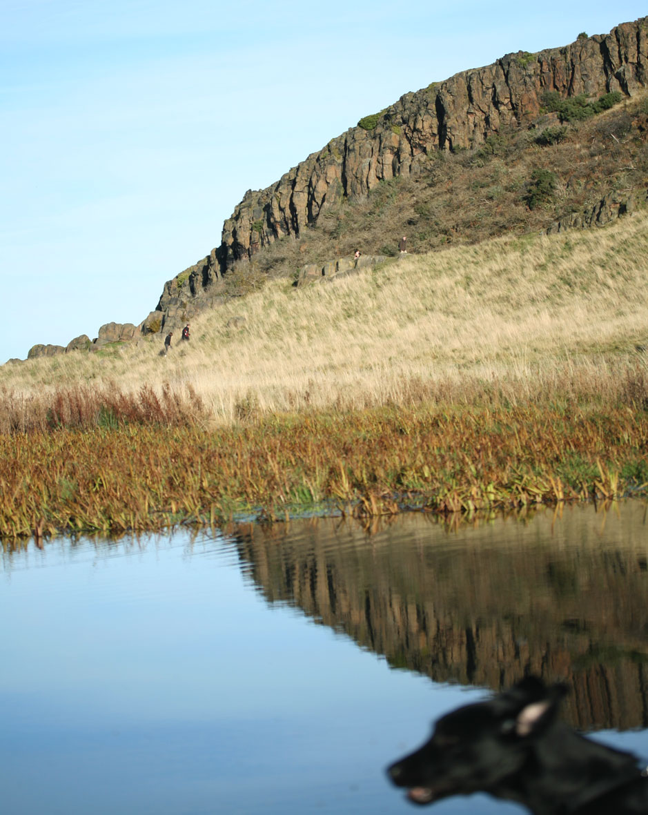 The weather has been glorious all weekend – the trees in Edinburgh seem at the height of their Autumn hues – and we’ve spent a lot of time outside enjoying some local colour. We completed a pleasant circuit of Holyrood Park today, taking a detour to visit Hunter’s Bog. For the running club to which Tom belongs, this bog is the stuff of myth and legend. In a slightly different sense, it has a near-mythic status for me too, for, despite the hundreds of times I must have wandered around Holyrood, I have never actually managed to come across this bog. In fact, I was beginning to doubt its very existence until Tom pointed it out to me quite recently from the top of Arthur’s Seat. From that distance it looked like an unimpressive muddy puddle, but I was assured its bogginess was much more powerful close-to.