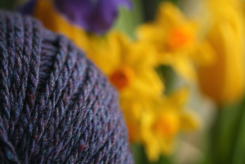 Now, this is curious, since I am not in the least a purple person (there is not a single purple item in my wardrobe, for example). This yarn has been sitting in my stash for an aeon – I bought it several years ago in a place with very poor lighting, thinking it was indigo blue. But it is most definitely purple – one of the purplest purples I have seen, in fact – and the more one knits it, the purpler it becomes. I rather like it. What am I knitting? Well, I am reformatting and updating a few of my patterns with a view to their forthcoming wholesale availability in Canada and the US, and I thought I’d make a fresh sample of one of my sweaters that only takes a few days to knit up. I am sure you can guess what it is. There may be a purple appearance soon.