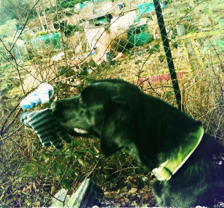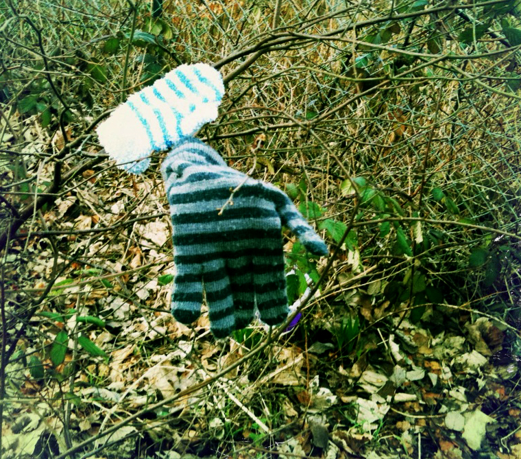 The gloves were still there when I passed by earlier, but had been joined by a wee stripey companion. . .