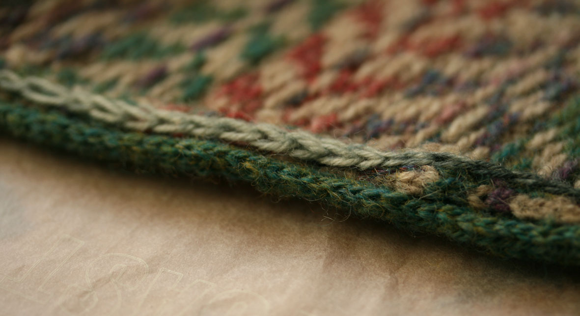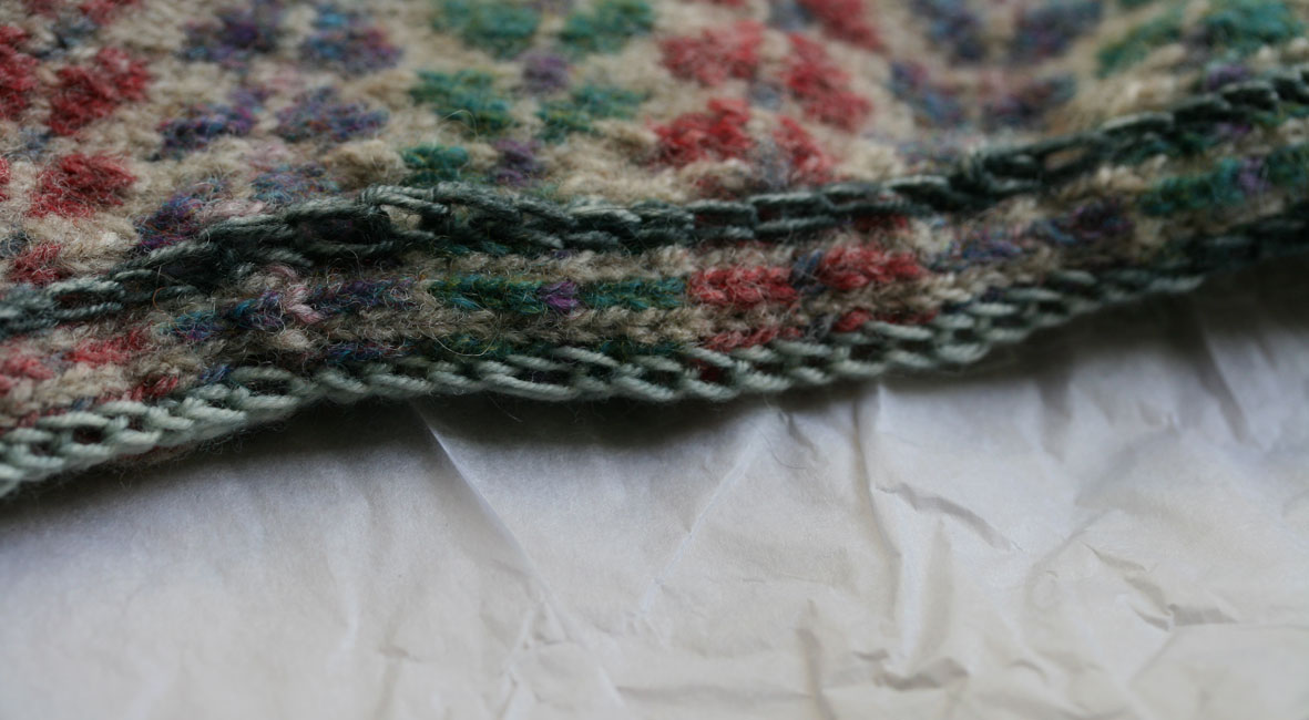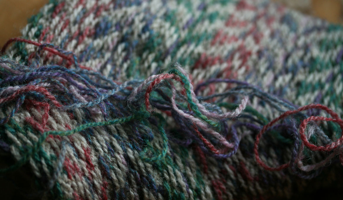 This elaborate swatch, upon which one may practice shaping, steeking and other techniques involved in making the Christie Johnstone sweater, is ravelled here.