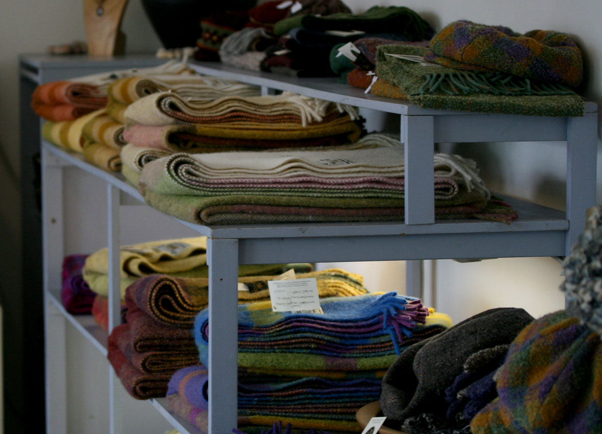 As in some parts of Scotland, Ireland abounds with woollen ‘mills’ that are not, and purveyors of ‘traditional crafts’ which turn out to be sweaters mass-produced in the far east. Down with this sort of thing! At Studio Donegal, one breathes a happy sigh of relief. There is a strong sense of the area’s textile history in Kilcar, but Studio Donegal is very clearly a working business, not a heritage centre. There is a workroom with some fabulous old looms where you can see Donegal Tweed being woven – and, here you are watching working weavers, not a ‘demonstration’ or ‘performance’ of weaving. Downstairs is a shop filled with lovely woolly stuff made by the folk upstairs.