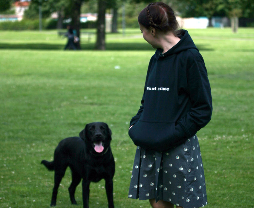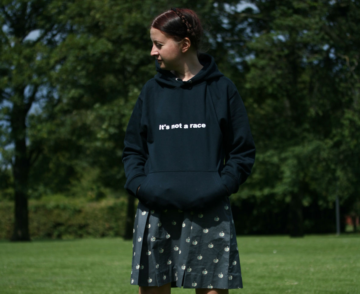 This is not an ideal garment for this weather (it is actually HOT here), nor would it be appropriate garb when one is out supporting one’s partner . . . who is actually running a race. . .