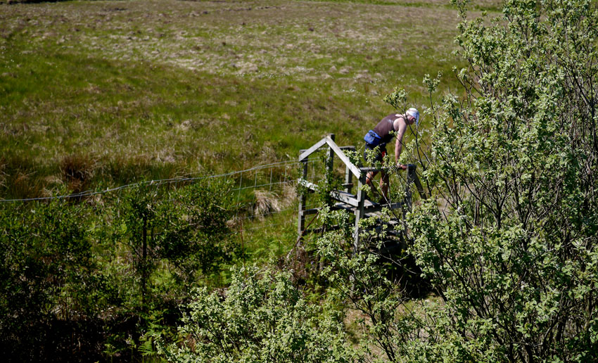 On race day, I timed my tricycling to Tom’s predicted finishing time, and happily made it to the bridge just a few minutes before he appeared off the last hill. You’ll have to take my word for it that the tiny dot in the centre of the picture is Tom (the slightly larger figure to the left is a race marshall).