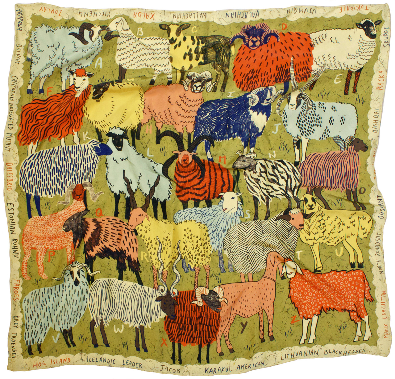 And the fabulous image at the top of this post is a silk scarf depicting an A to Z of rare sheep breeds. It was designed by US illustrator Caleb Luke Lin – I love his work!