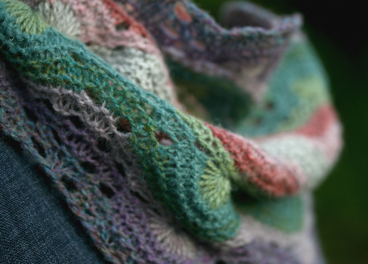 Just popping in to show you a few photos of the new BMC sample which will be coming with me to Woolfest. I wrote the pattern for two sizes of cowl – small and large. The large one you may have already seen, and this is the small. This size is worked over 7 repeats of the pattern (as opposed to 26) which means that you only have to cast on 147 stitches (as opposed to, ahem, 546).