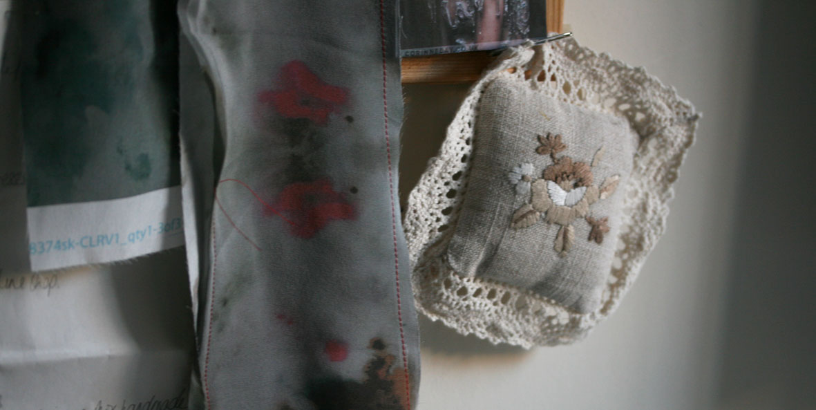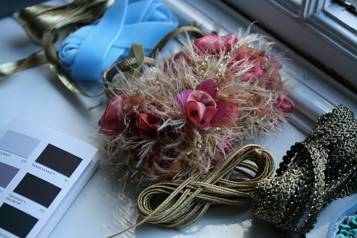 The studio is full of haberdashery — gorgeous trims and findings. . .