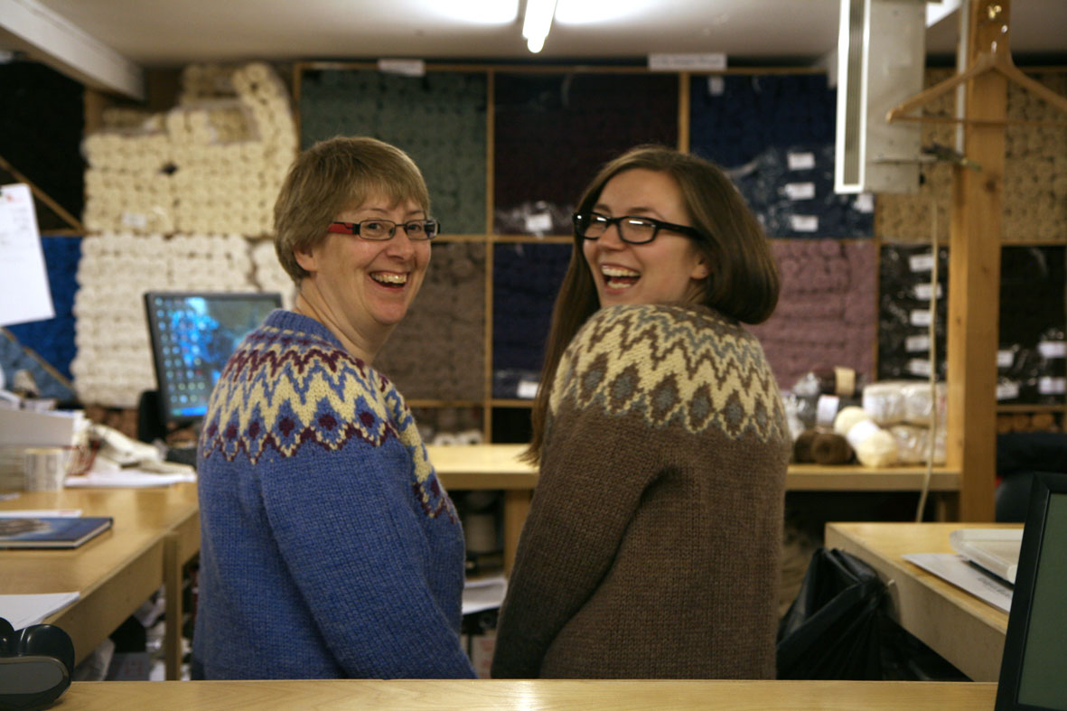 My sister, Martin Curtis and me, meeting Sophie, Countess of Wessex (note: Helen is wearing a Manu and knitting a Betty Mouat Cowl, I am wearing a Deco and knitting a puffin sweater, and Sophie is looking at a copy of Knit Real Shetland).