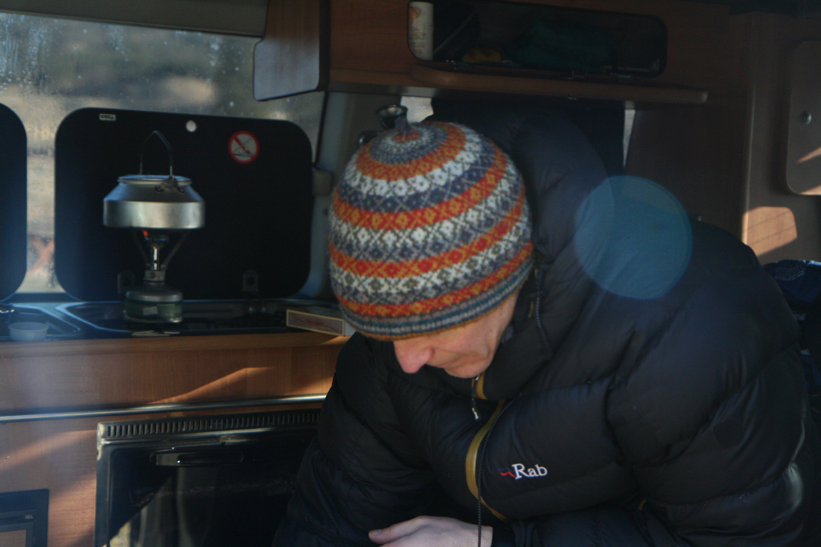 In the morning, there was ice all over the van, and the water had frozen in the pipes. And then we discovered that the van had run out of cooking gas. Kate was extremely worried that she would not be able to have her requisite Giant Cup of Tea, but disaster was averted by Tom, who is the keeper of all equipment, and who had the forethought to bring the spare camping stove.