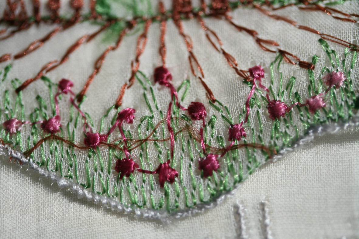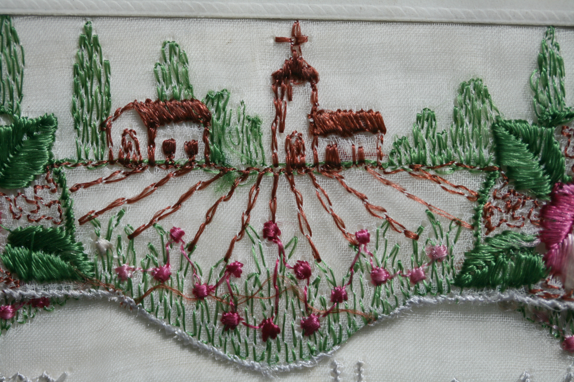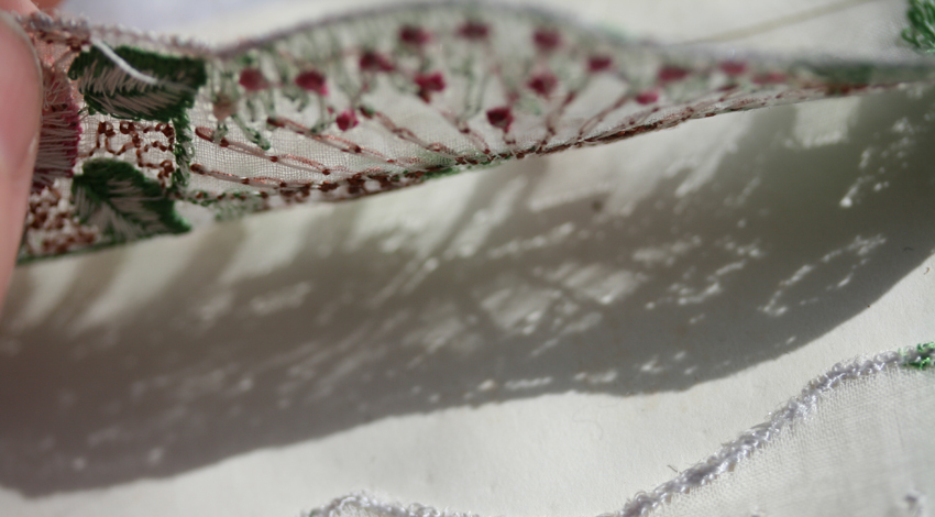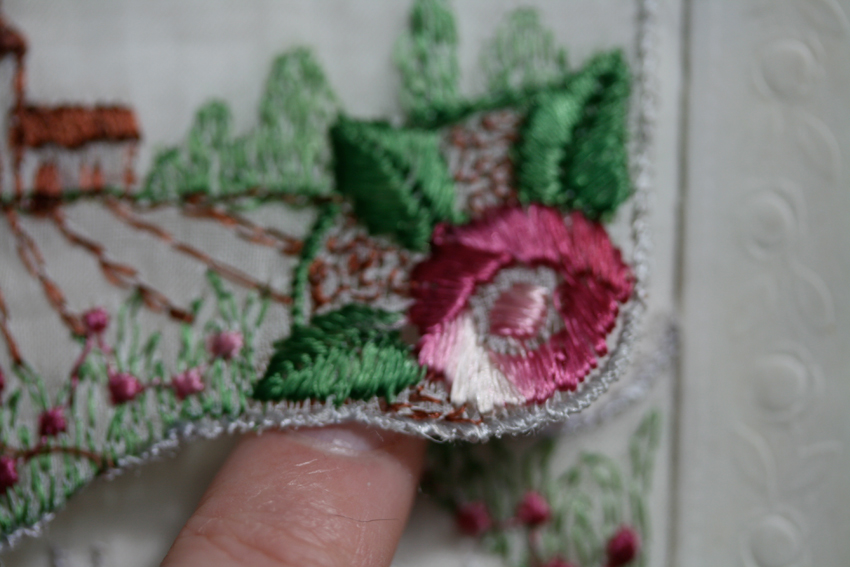 Sources used to suggest that these cards were hand-embroidered, but this isn’t the case. Though particularly elaborate panel designs might involve finishing by hand, I have never seen one that didn’t feature machine embroidery. Using innovative Heilmann or Schiffli embroidery machines, a design could be repeated up to 400 times across large panels of organdy before being cut out, and individually assembled into framed and embossed cards. There were several factories in France and Switzerland where cards might be manufactured from start to finish, but some machine-embroiders also produced piece work from home, sending completed panels to be finished and assembled elsewhere.