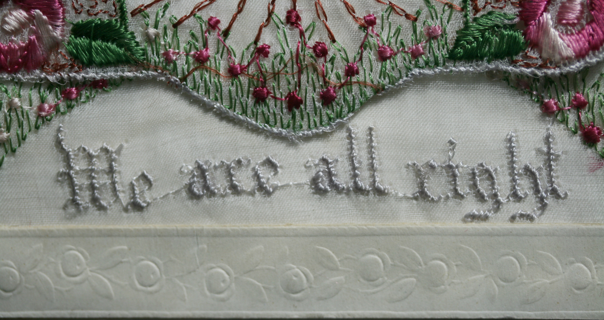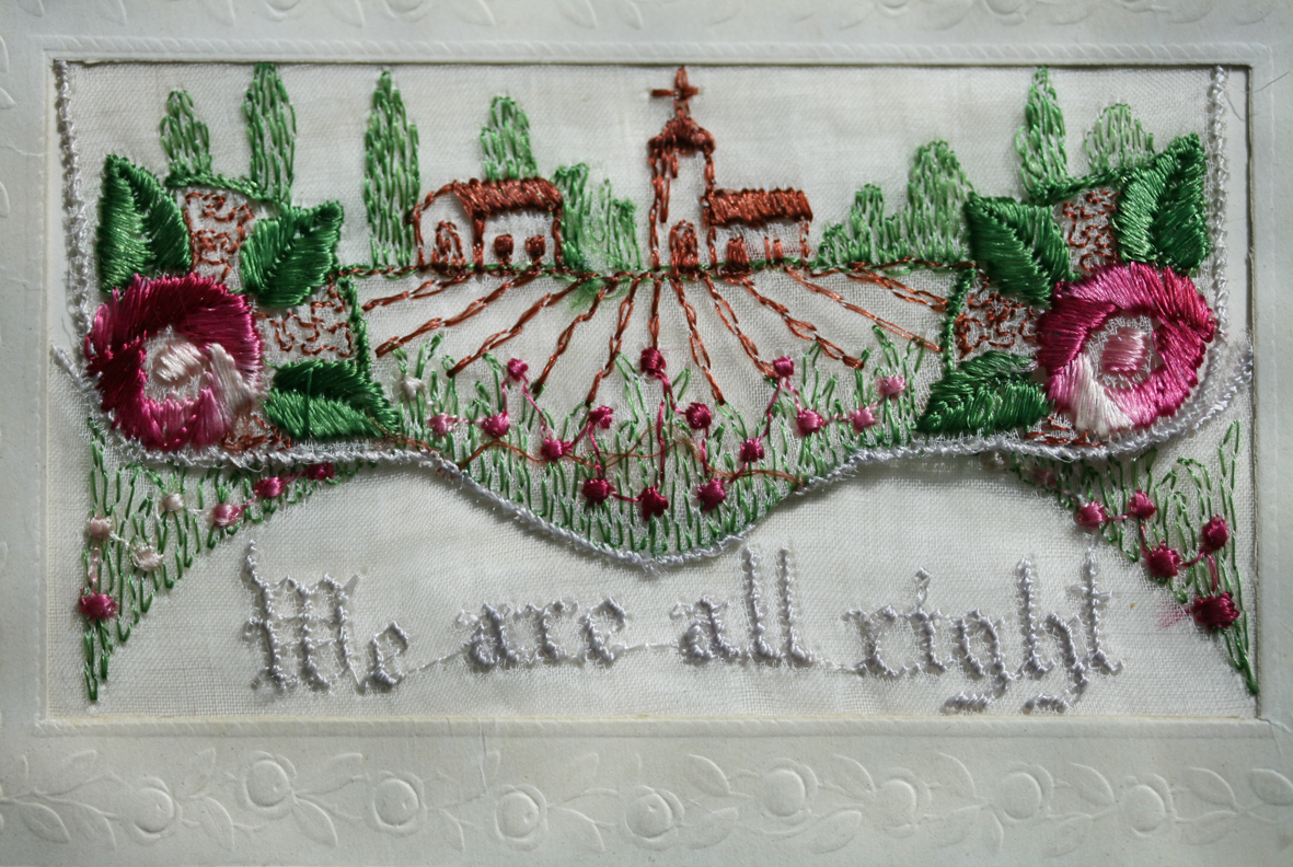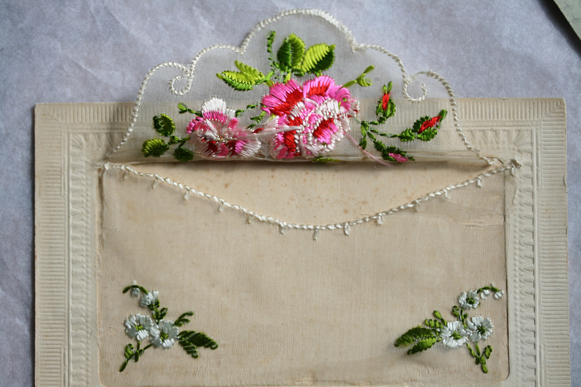 The cards were usually sent in military mail pouches rather than being stamped and posted in the ‘open’ mail. Because they were protected in transit, the embroidered panels could be quite delicate in design. Many of the cards use the structure of the embroidery to create a tiny envelope: