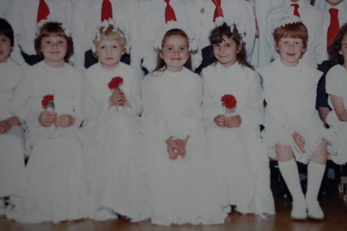 My mum is a whizz with the sewing machine. I couldn’t find a picture of the most memorable garment she made for me — a chocolate-brown dress with white polka dots, full skirt, and sweetheart neckline that I wore for my first grown-up party (a sort of prom equivalent, I suppose), but I did locate a photograph of me in my First Communion dress that she made from a Vogue pattern. I remember many details of this dress so clearly: it was lined, with a top layer of light cotton voile with teeny tiny pin-dots. There was a beautiful floral trim around the cuffs and bodice that my mum got from the market, and I remember that the whole thing hung really beautifully, and swished in a very pleasing fashion as I walked. I am the one sitting in the middle, without the red carnation.