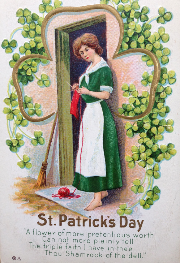 This is an American card dating from the very early 1900s. It is number 11 in the popular “St Patrick’s series,” whose tone is, of course, incredibly sentimental and nostalgic. One could hardly imagine a representation of Irish femininity more stereotypical — the knitter stands barefoot outside her “wee humble cottage” in a shamrock-encircled John Ford fantasy of rural domesticity. The knitting is a sort of accoutrement of her simplicity, and her bare feet are a familiar feature of other postcards in this series.
