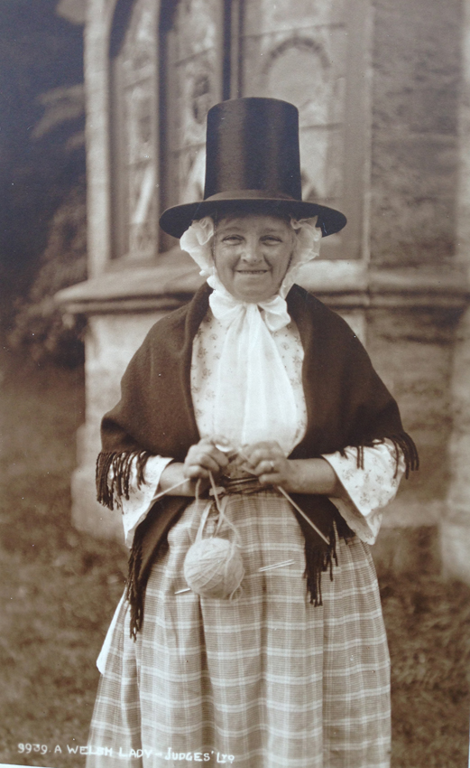 This card was produced in the early 1900s by venerable British photographers Judges (who are still in the postcard printing business after a more than a century). By this point, the figure of the “Welsh Lady” in stovepipe hat and shawl had become a recognisable tourist novelty. Here, the ball of yarn and needles have been taken out of the dressing-up box to form decorative additions to her “costume.” I am interested in the subtle shifts of representation of Welsh women’s hats — as, in many Eighteenth-Century accounts I’ve read, the wearing of men’s hats is described as masculinising Welsh women in various ways. In this context, Eleanor Butler and Sarah Ponsonby’s signature hats seem to be a deliberate form of costume, but by the time of Augusta Hall’s famous Cambrian sketches, the hats have become picturesque – and acceptably feminine – curiosties.
