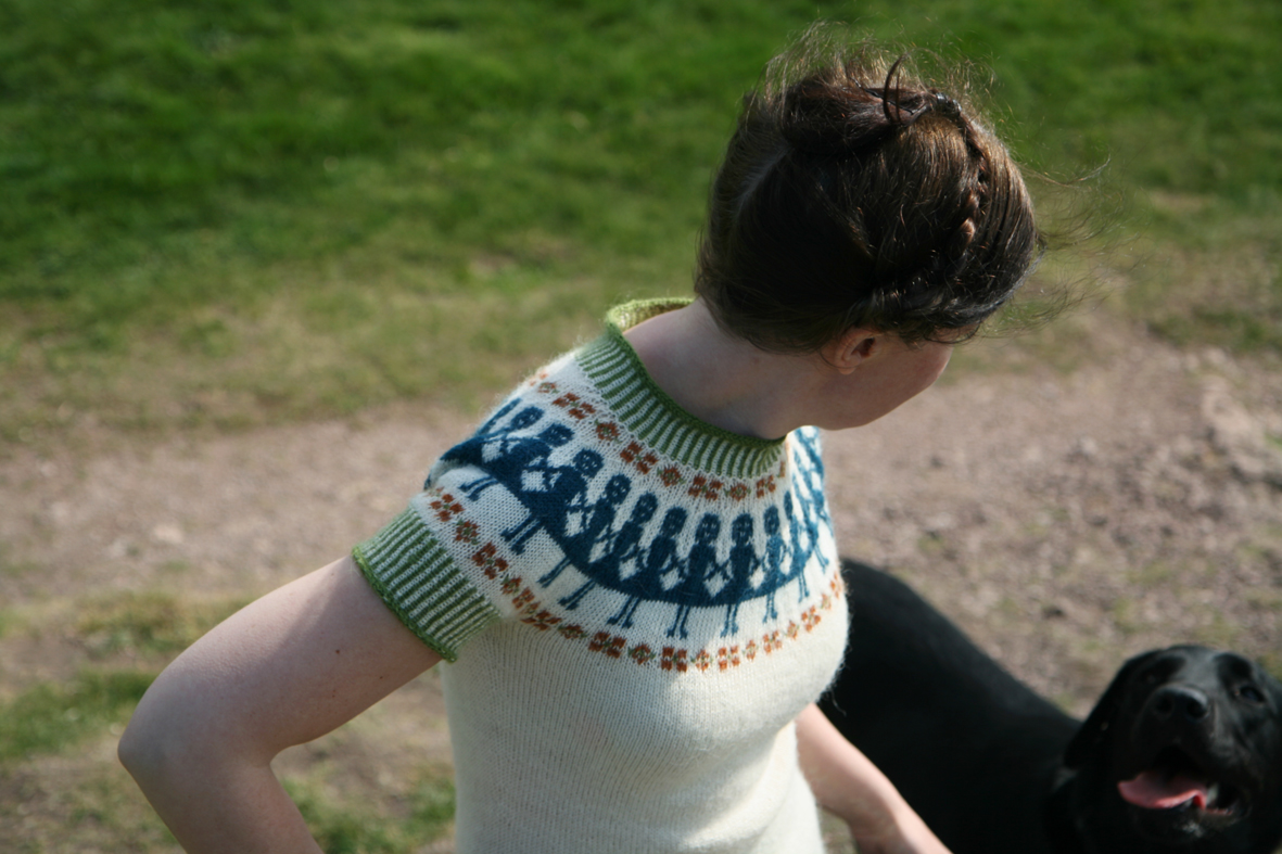When I first published this design a few years ago, I used a lovely British yarn that is sadly no longer available — Bowmont Braf 4ply. Many knitters prefer to make their sweaters in the same yarn as the pattern sample, and I often receive queries from folk enquiring about the yarn I used for my original Paper Dolls. I am always sad to tell them that it is no longer readily commercially available (almost as much for me as them — how I loved that Bowmont Braf . . . though I might have a secret stash of it somewhere . . .)*