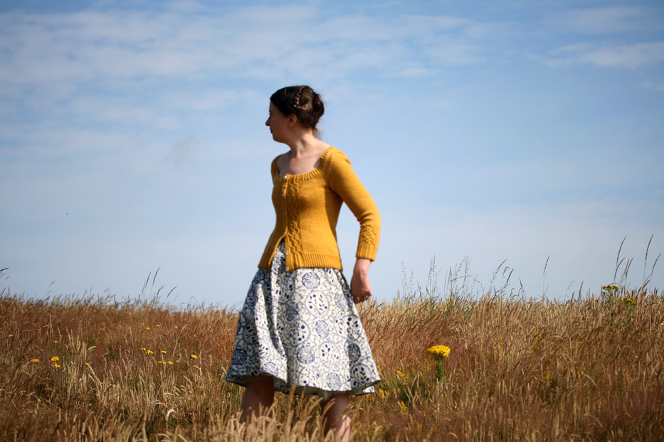 We have just returned from a photoshoot. It is a very hot day and Tom couldn’t stop taking photographs of Bruce’s monumental panting tongue. (Don’t worry, he was supplied with plenty of water). In between the hot dog shots, he was photographing my new pattern – a cardigan, which is due for release toward the end of the month. I am very pleased with this design, and couldn’t resist showing you a couple of outtakes from the shoot.