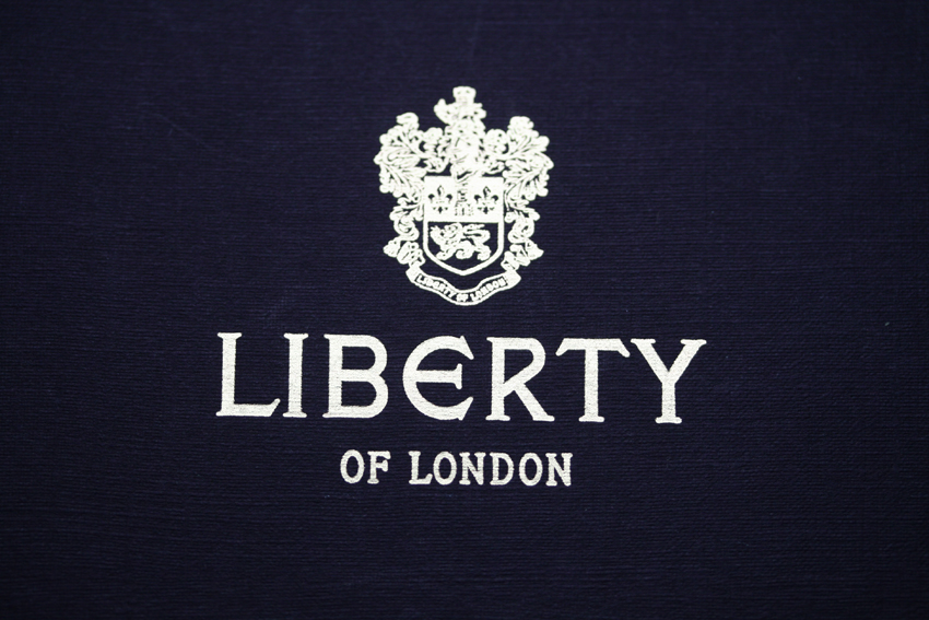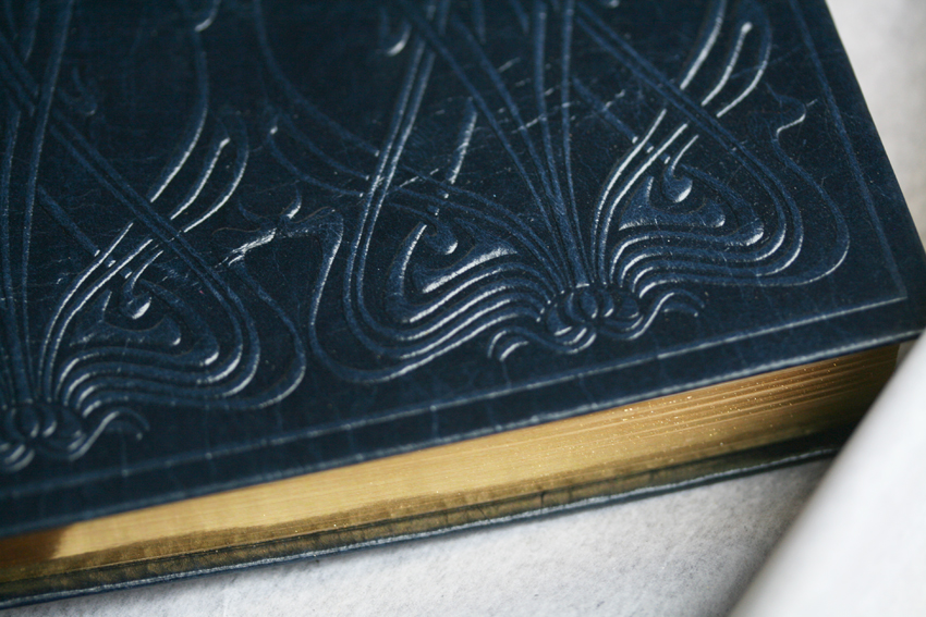 A blank book, bound in navy embossed leather, from Liberty’s.