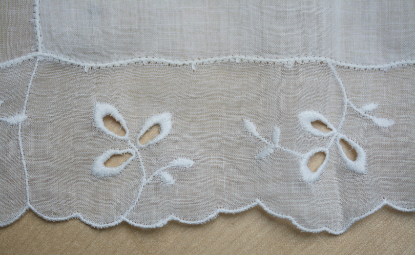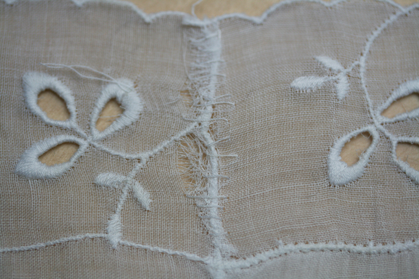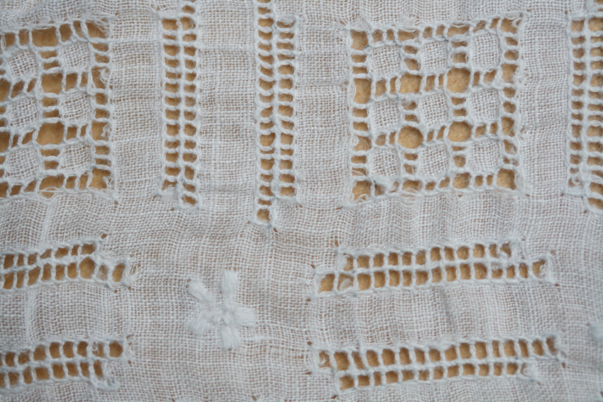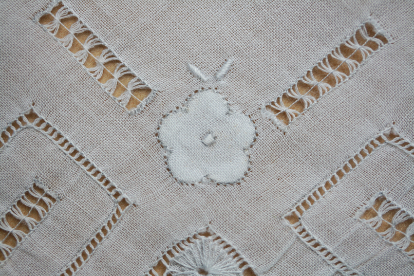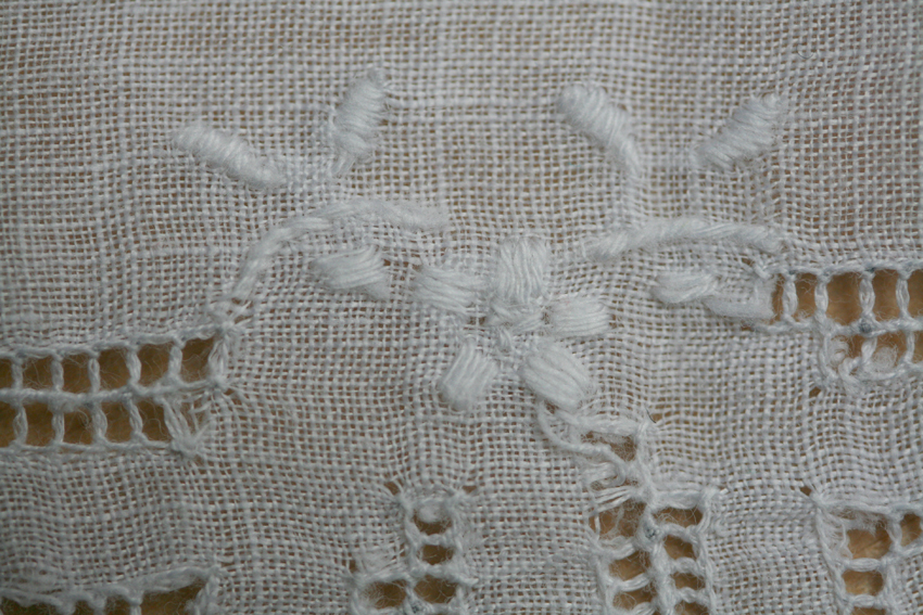 and of course, I have also acquired a few that are just too nice to use. This one is an interesting combination of drawn-thread work with machine embroidery.