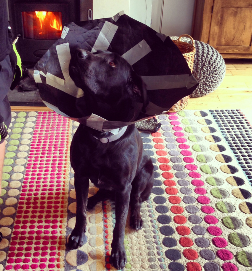 . . . Bruce has hurt his nose, forcing us to construct a makeshift cone out of pieces of plastic pending a visit to the vet. . .