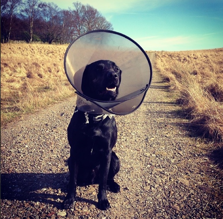 Worry not, friends of Bruce: he is doing fine. The cone is a wee bit tiresome for everyone, but his snout is healing, and we will be back at the vets this afternoon.