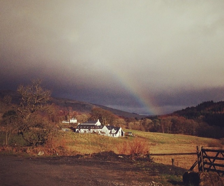 It is a lovely time of year, and, as the weather starts to change I am really appreciating our new situation. Our house is in the middle of the photo above – one of five properties on a small steading, situated at about 250m above sea level. In front of the steading, to the South, the land dips away to a small lochan. To the North, East and West, we are surrounded by hills and woods. After living in a city, when one steps outside, the space here sometimes feels immense to me, but because of our location, there is also the interesting sensation of being cradled in the landscape, a dip in the earth sheltered by a canopy of sky. Yesterday I took a walk around the loch with Bruce, and felt this very distinctly. The arc of this rainbow shifted round the landscape with me, curving over the steading and seeming to somehow illuminate it.