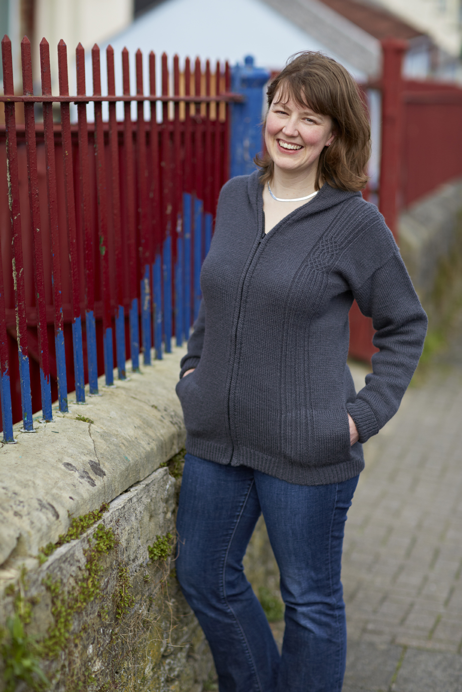 As part of our Cross-Country collaboration, Jen and I thought it would be interesting to interview each other about our different approaches to producing our different designs. (You can read Jen’s interview with me over on her blog today.) Jen is a sharp, focused and highly professional tech editor. In this capacity, she has worked with me on many projects, including Colours of Shetland. But she’s also an accomplished designer, though for some bizarre reason she doesn’t really think of herself as such. This is something that I think needs to change, because Jen designs beautiful, well-thought out patterns, and has, I think, a genuine feel for the structure and behaviour of textured stitches. She has a real knack of bringing a classic design to life with a well-thought out, well-placed motif, such as that which you can see on her Puffin Apple hat above, or the Bruton Hoody (below) that she designed for Cross-Country Knitting. Jen, you are a talented designer, and must keep on designing! (Anyway, you can’t stop now as there are already plans afoot for Cross-Country Knitting Volume Two! ho ho.)