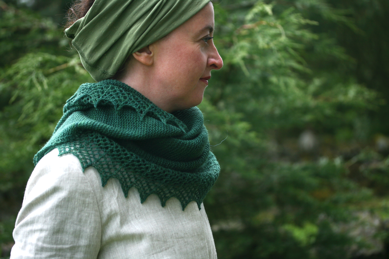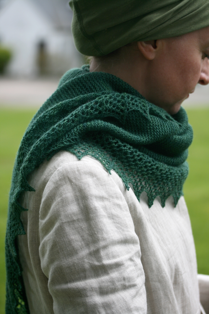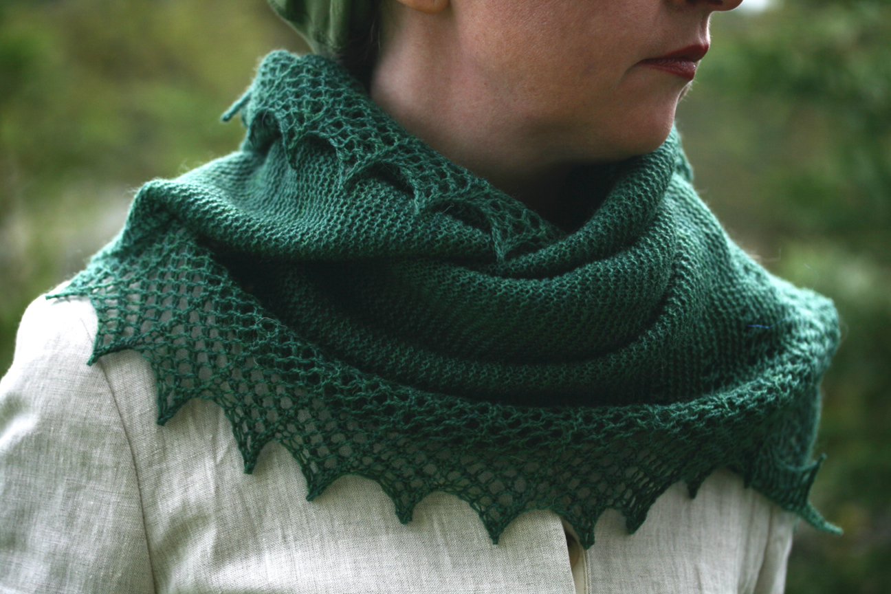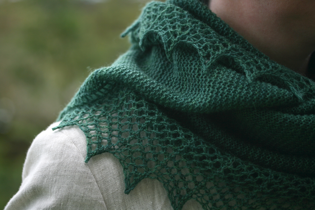 The hap features a garter stitch centre and a Shetland openwork edging which creates a series of sweeping points. The construction is very simple: it is knit from side to side, the edging and centre are worked simultaneously, and some shaping is added to create a long, shallow triangle.