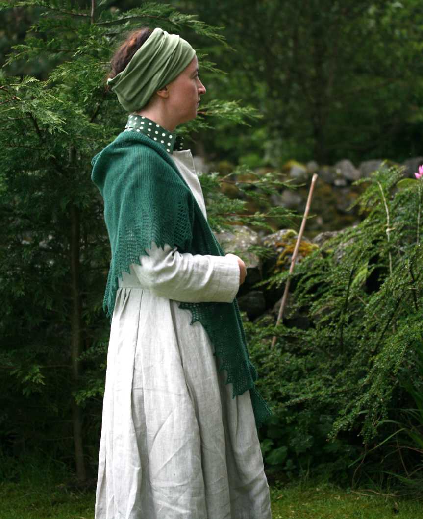 A totally lovely pattern in my favourite colour. You never disappoint. Also, your linen dress (or is it a tunic?) makes a wonderful go-together. I think I’m inspired to try designing a hap.
