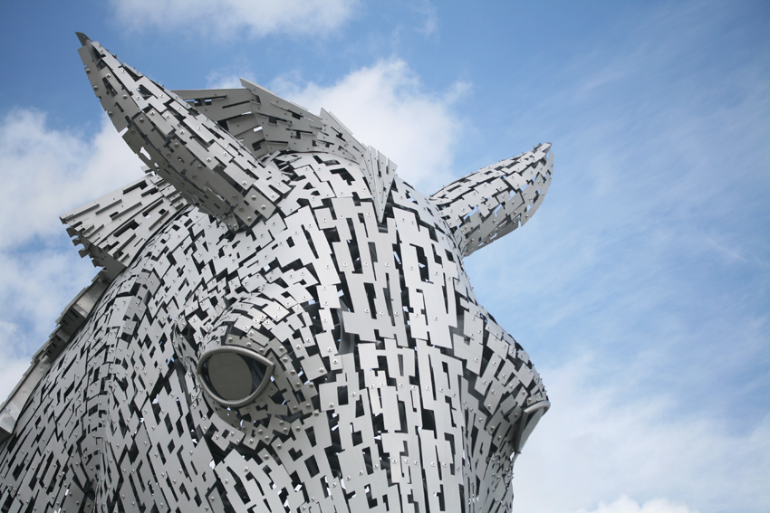 Taking the fabled creature as a starting point, Glasgow sculptor, Andy Scott has constructed a new mythology for the kelpie — one with a refreshingly specific sense of place, and history. Directly inspired by two local Clydesdale horses – Duke and Baron – Scott’s Kelpies celebrate the beasts who once pulled ploughs, carts and barges — effectively powering the industrial revolution in central Scotland through the Eighteenth and Nineteenth centuries.