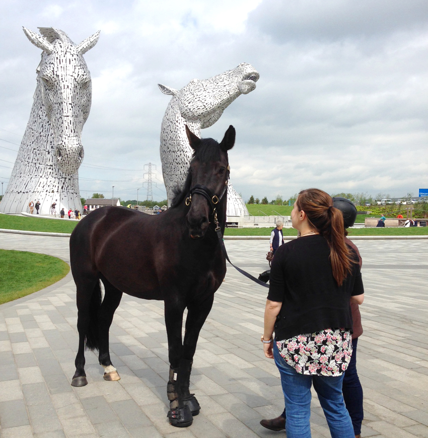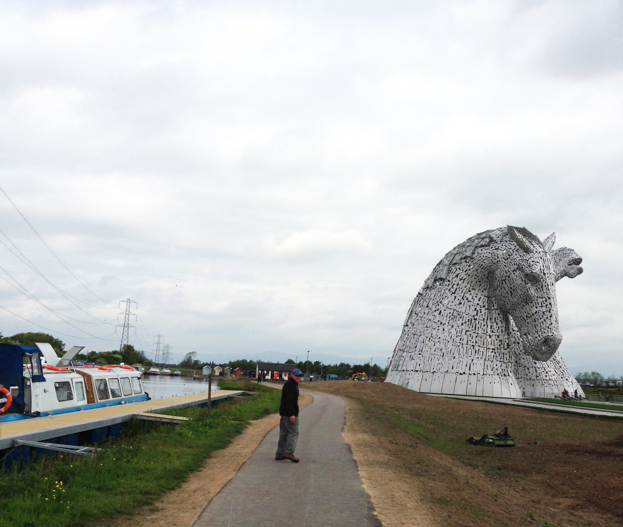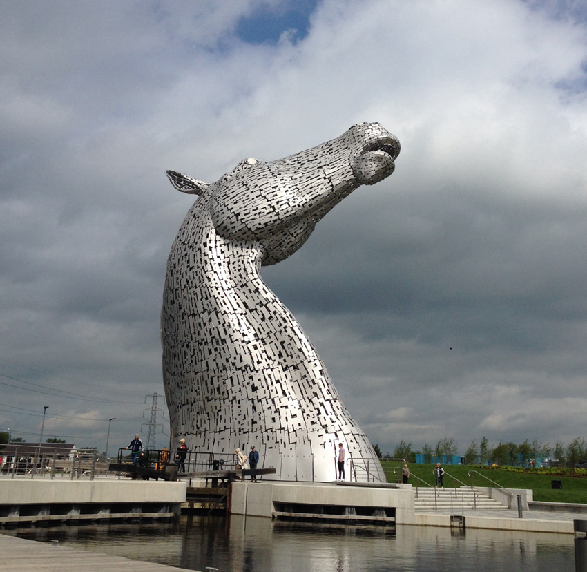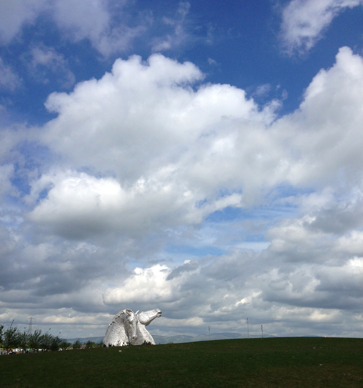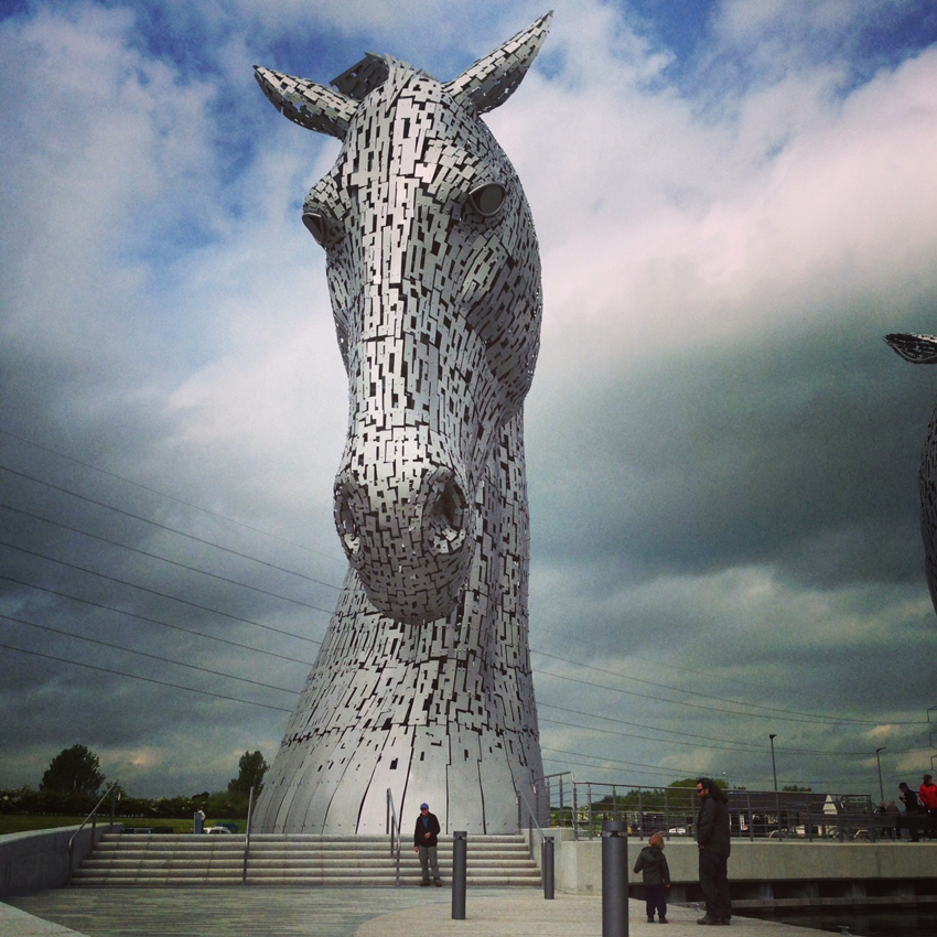My parents have been visiting, and I thought they might like to see The Kelpies. A few years ago we rather enjoyed visiting Jaume Plensa’s Dream, a meditative and beautiful public sculpture commemorating Lancashire’s mining past. Like Plensa’s Dream, The Kelpies celebrate industrial heritage, but are things of water rather than of light. Kelpies are mythical Scottish water beasts, generally malevolent in nature, and able to assume many different forms. The Loch Ness “monster” should perhaps be more accurately described as a kelpie, and in Scottish song, art and literature, kelpies most often take the shape of a horse.