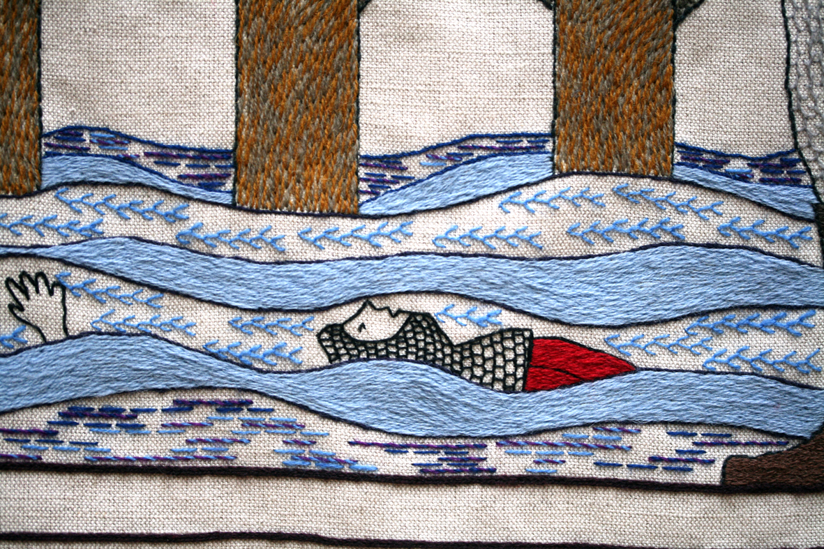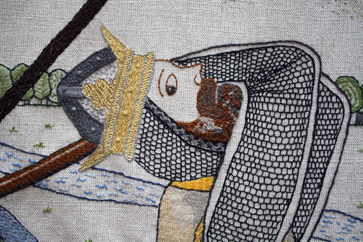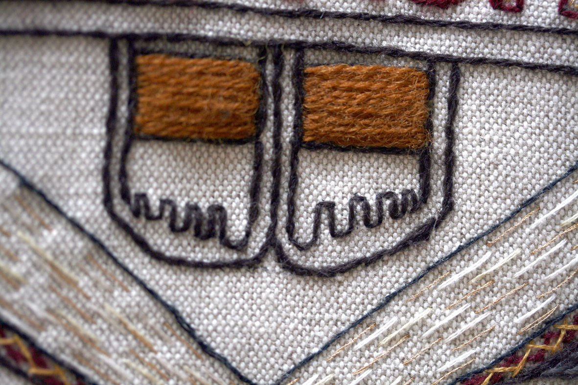 Panel 27: Haakon at Kyleankin. Signature of the South Skye stitchers who created this panel, which depicts twelfth century Norweigan / Scottish conflicts. The Orkney and Shetland islands remained in Norweigan / Danish hands until 1469.