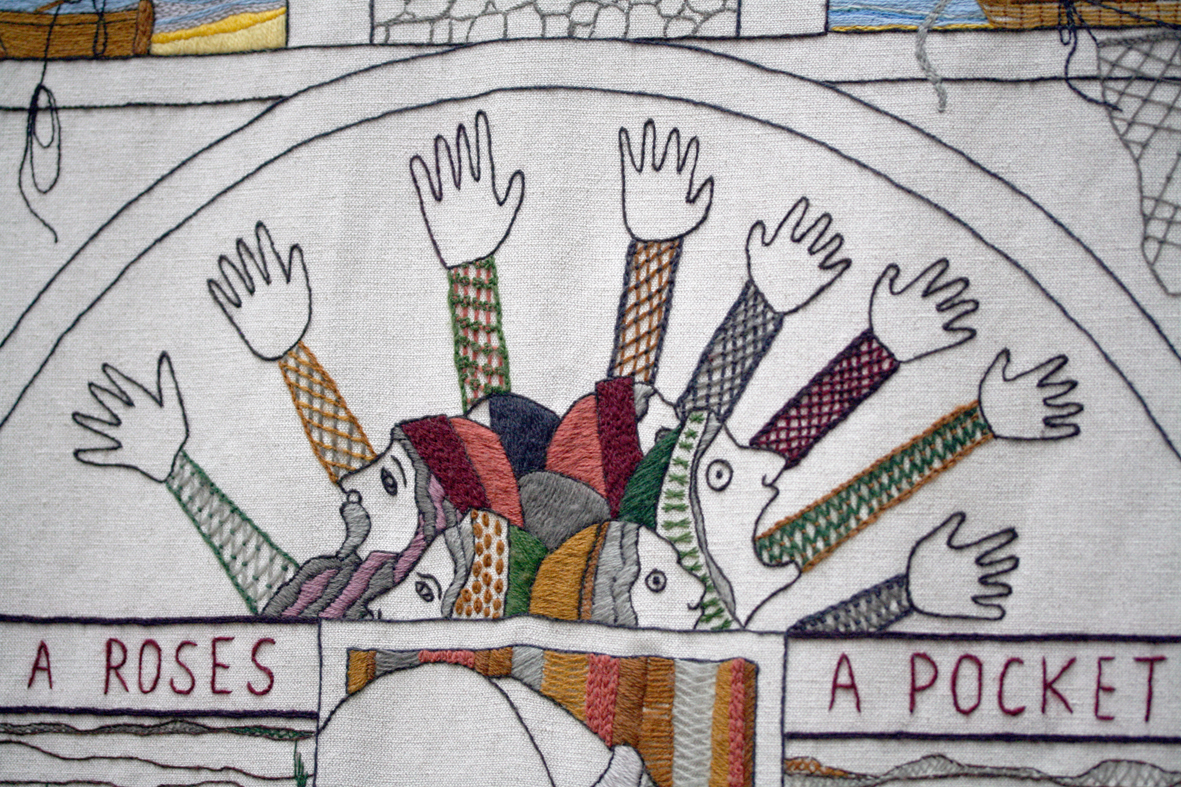 Panel 51: Droving One of many panels where Crummy’s drawings and the work of the stitchers inventively combine the human figure and the landscape. The figure of the drover emerges from and merges with the rolling hills and green fields.