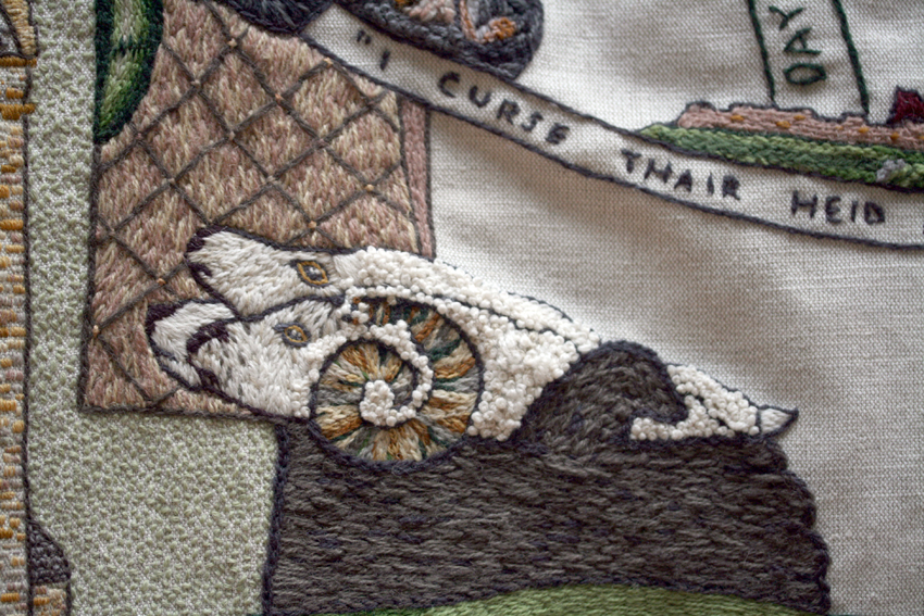 Panel 54: The massacre at Glencoe. The stitching here absolutely kills me. The way the weave of the plaid, and the folds of the cloth have been rendered is amazing.